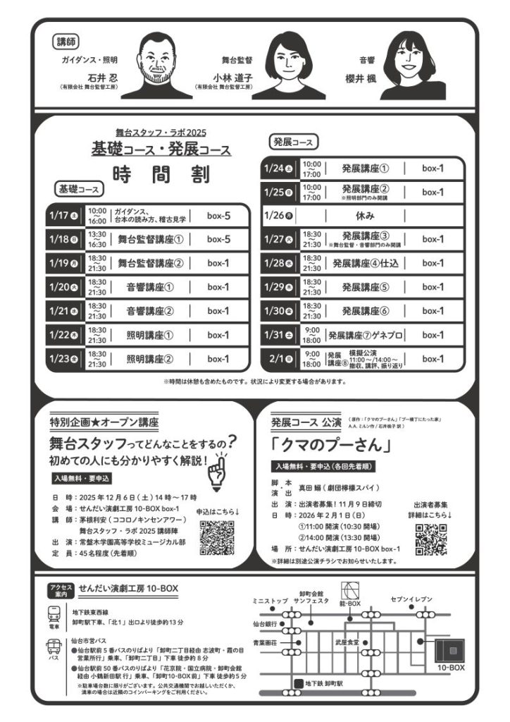 【オープン講座】 2025年12月6日(土曜日) 14時00分~17時00分 【基礎・発展コース共通・ガイダンス及び模擬公演の稽古見学】 2026年1月17日(土曜日) 10時00分~16時00分 【基礎コース・各部門】 2026年1月18日(日曜日)~1月23日(金曜日) 18時30分~21時30分 【発展コース・模擬公演本番】 2026年1月24日(土曜日)~2月1日(日曜日) 詳細は、せんだい演劇工房10-BOX ホームページ https://www.gekito.jp/index.cgi?pg=1757469584 をご確認ください。 |