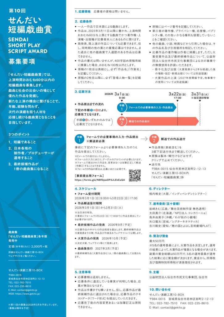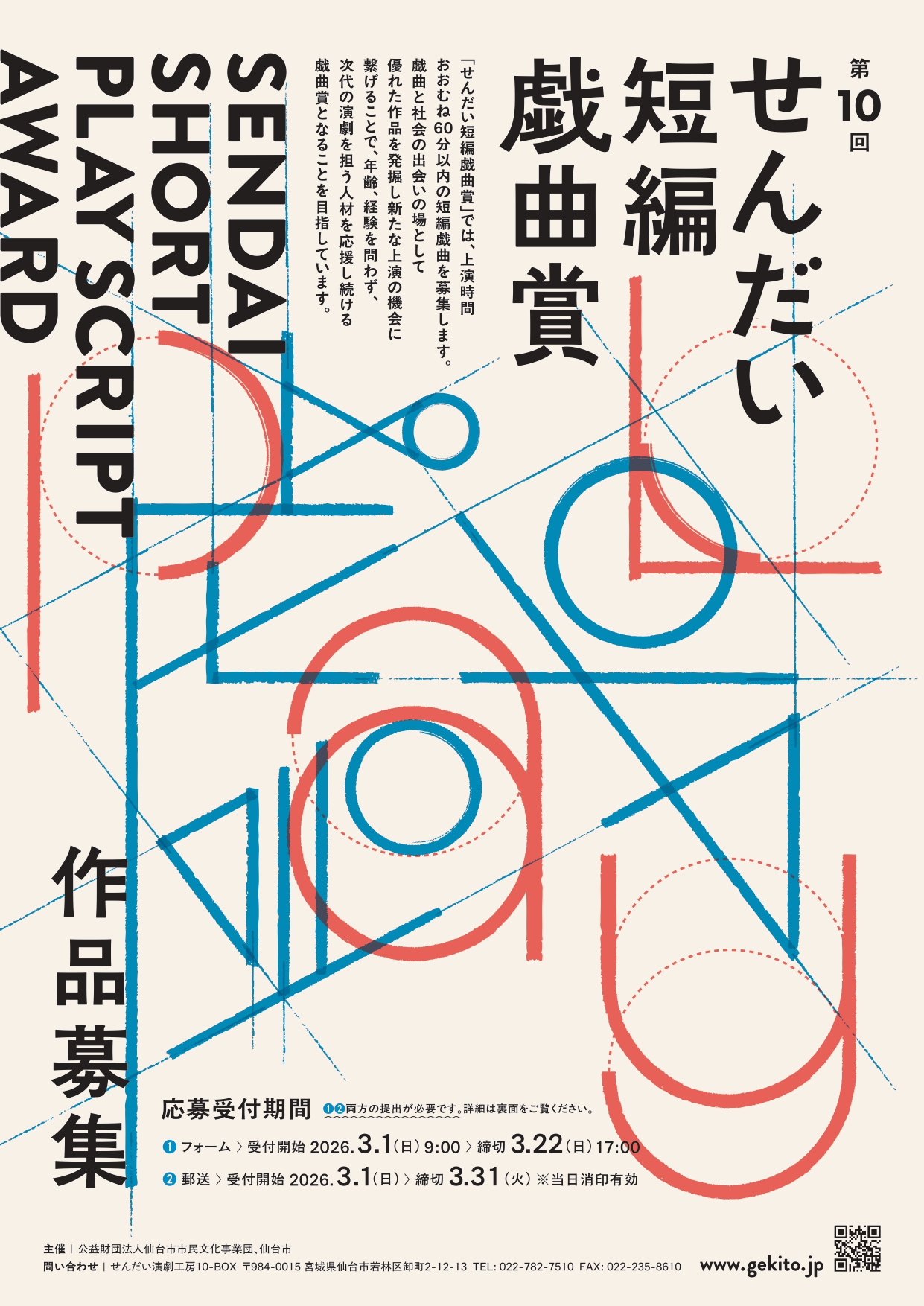 | プレイガイド・申込方法 | 募集要項・応募方法については、せんだい演劇工房10-BOX公式サイト(https://gekito.jp/?pg=1763110414 )をご確認ください。 |