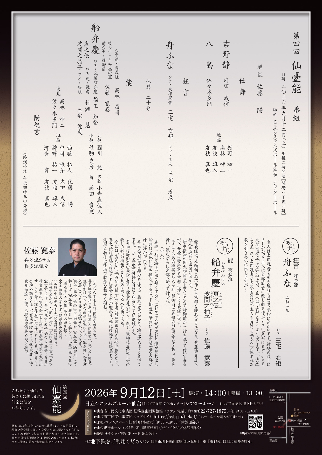 | 主催 | 仙台市能楽振興協会・仙台市・公益財団法人仙台市市民文化事業団 |