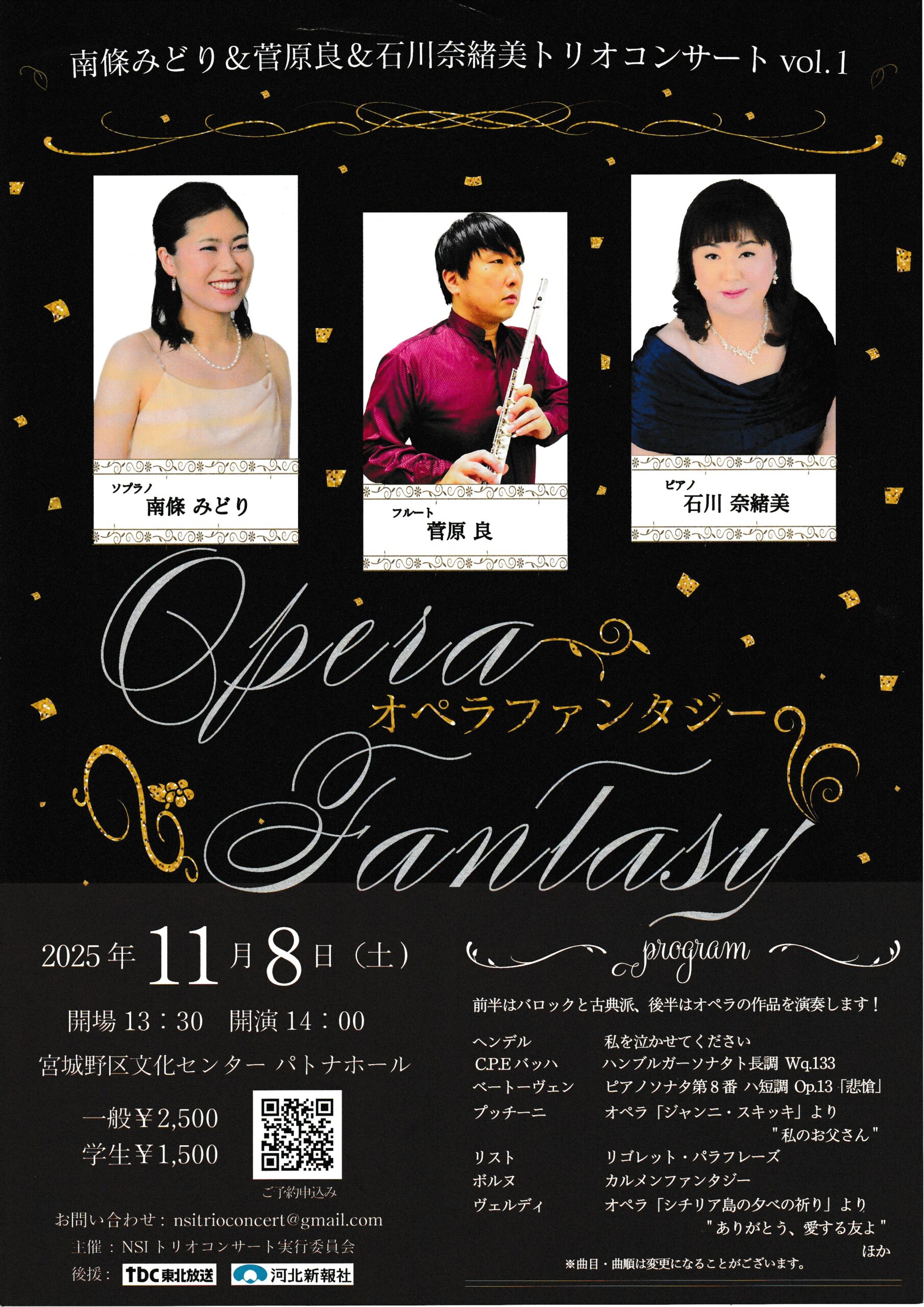 南條みどり&菅原良&石川奈緒美 トリオコンサート Vol.1 公演 ソプラノ南條みどり、フルート菅原良、ピアノ石川奈緒美によるクラシックトリオコンサートです。 開催日 2025年11月08日(土曜日) 時間 14時00分〜16時00分 会場 宮城野区文化センターパトナホール 料金 一般 2500円 学生 1500円 主催 NSIトリオコンサート実行委員会 お問い合わせ メール nsitrioconcert@gmail.com ジャンル 音楽