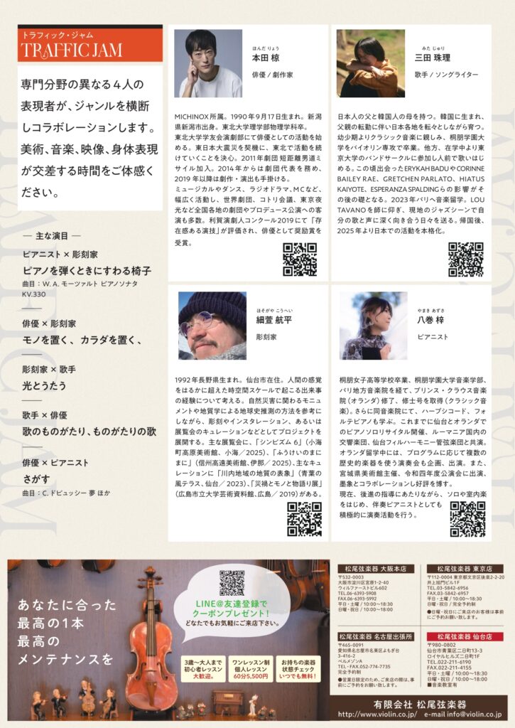トラフィック・ジャム ― 音・声・かたち・身体の交差点 ― 公演 展示 専門分野の異なる4人の表現者が、ジャンルを横断しコラボレーションします。美術、音楽、映像、身体表現が交差する時間をご体感ください。※パフォーマンス時間外の開場時間は、展示作品をご覧いただけます。 開催日 2026年02月14日(土曜日) 時間 【開場】 13時00分~17時00分 【パフォーマンス】 14時00分~16時00分 会場 エル・パーク仙台 スタジオホール 料金 2,500円(全席自由) 主催 トラフィック・ジャム実行委員会 お問い合わせ [メール] azusamusic31@gmail.com(八巻) 詳細情報 予約フォーム ジャンル 音楽、美術、演劇