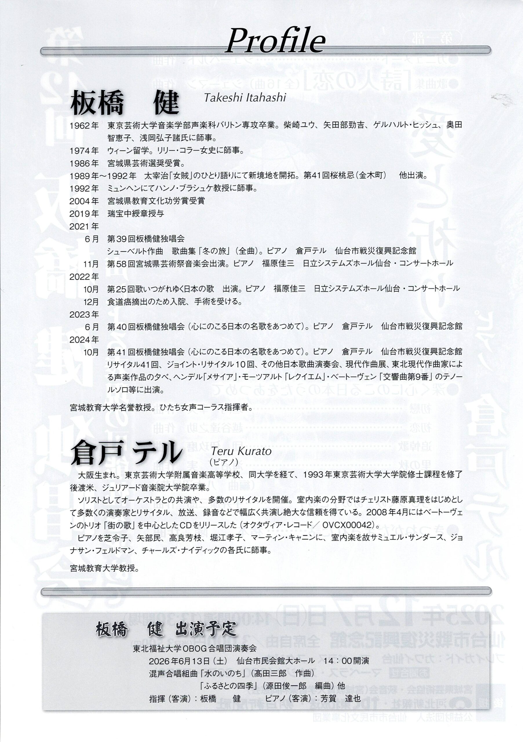 板橋健による声による表現の可能性を求めてと続けている42回目の独唱会です。今回はシューベルト、シューマン、日本歌曲をお楽しみいただきます。ピアノは倉戸テル氏です。
