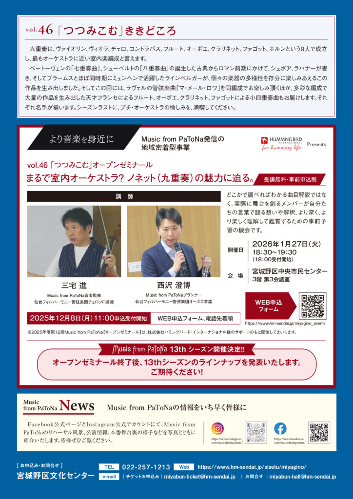 宮城野区文化センター室内楽セレクション Music from PaToNa vol.46「つつみこむ」