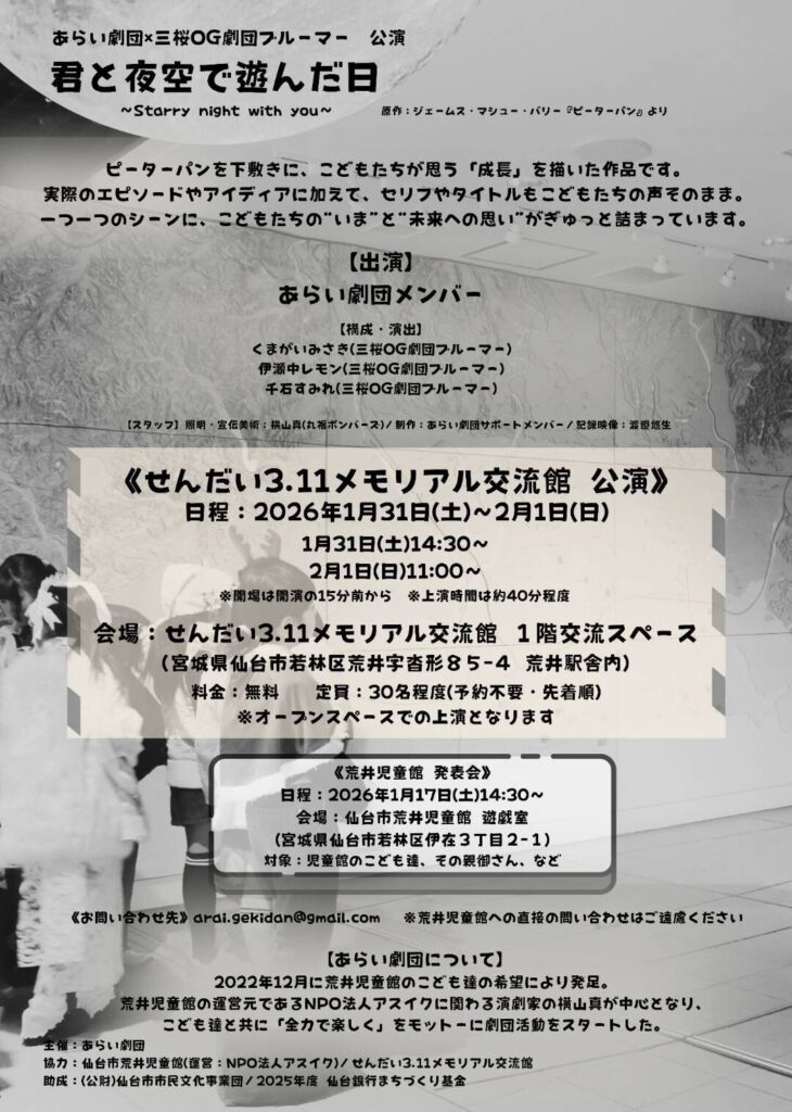 荒井児童館のこども達(小学3~6年生)で結成した「あらい劇団」と、在仙の劇団「三桜OG劇団ブルーマー」が協力し、『ピーターパン』をモチーフにした作品を創作し発表します!